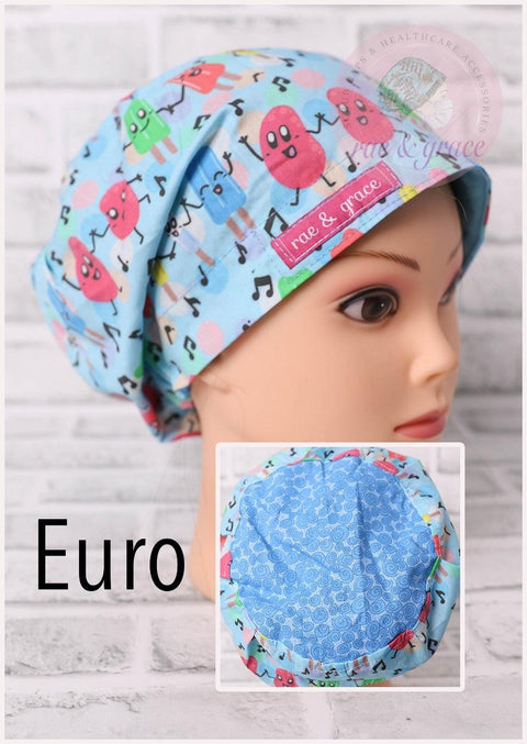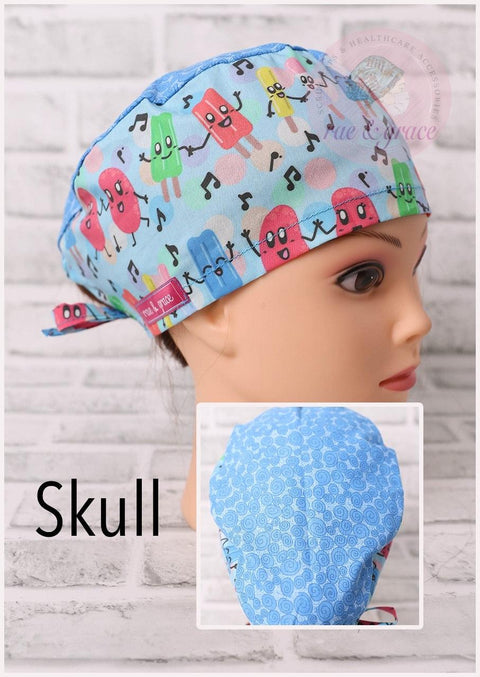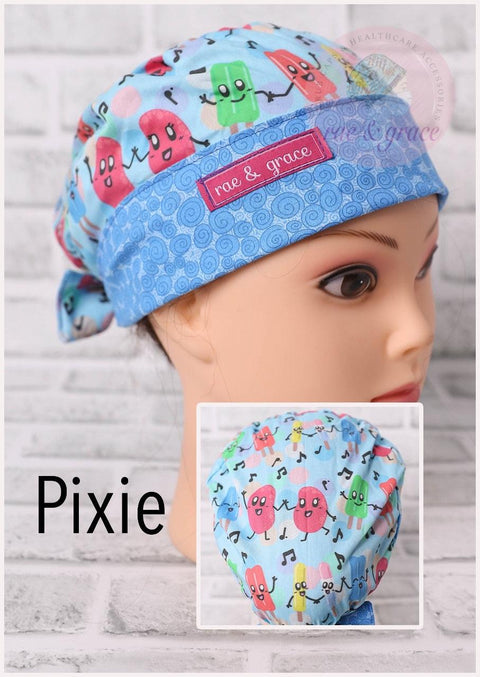 Pixie - Larger take on a Skull Cap. Sewn-in elastic for extra stretch and added space if needed. Ties in the back for a custom fit. Double-lined with accent material to fold over for a cute look.