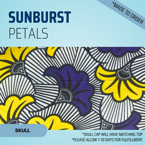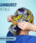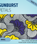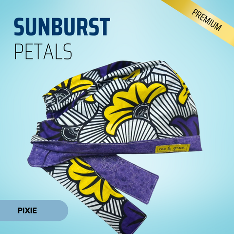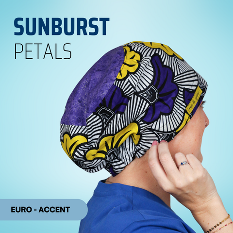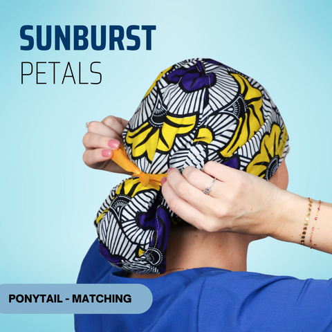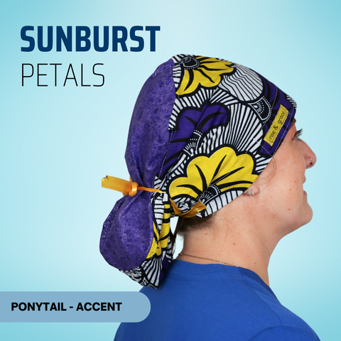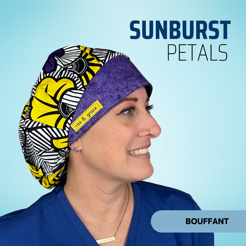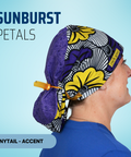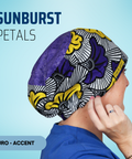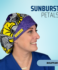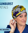 Bold and vibrant, the Sunburst Petals scrub cap features golden yellow and deep violet florals bursting across crisp black and white linework.